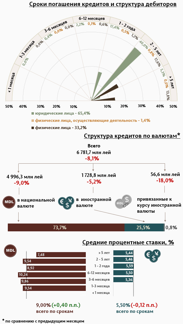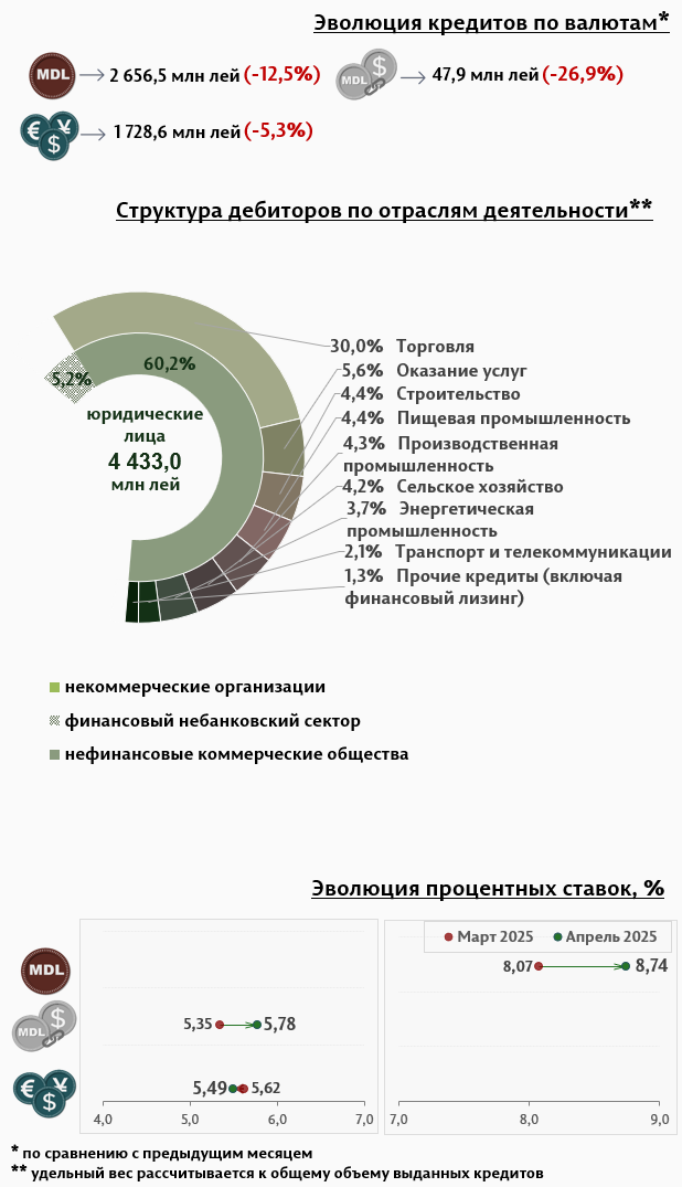 В апреле 2025 г. вновь выданные кредиты1 составили 6 781,7 миллиона леев, на 8,1% меньше, чем в марте 2025 г. (Инфографика 1). Основная часть (73,7%) пришлась на кредиты в национальной валюте, которые составили 4 996,3 миллиона леев, уменьшившись на 9,0% по сравнению с предыдущим месяцем.