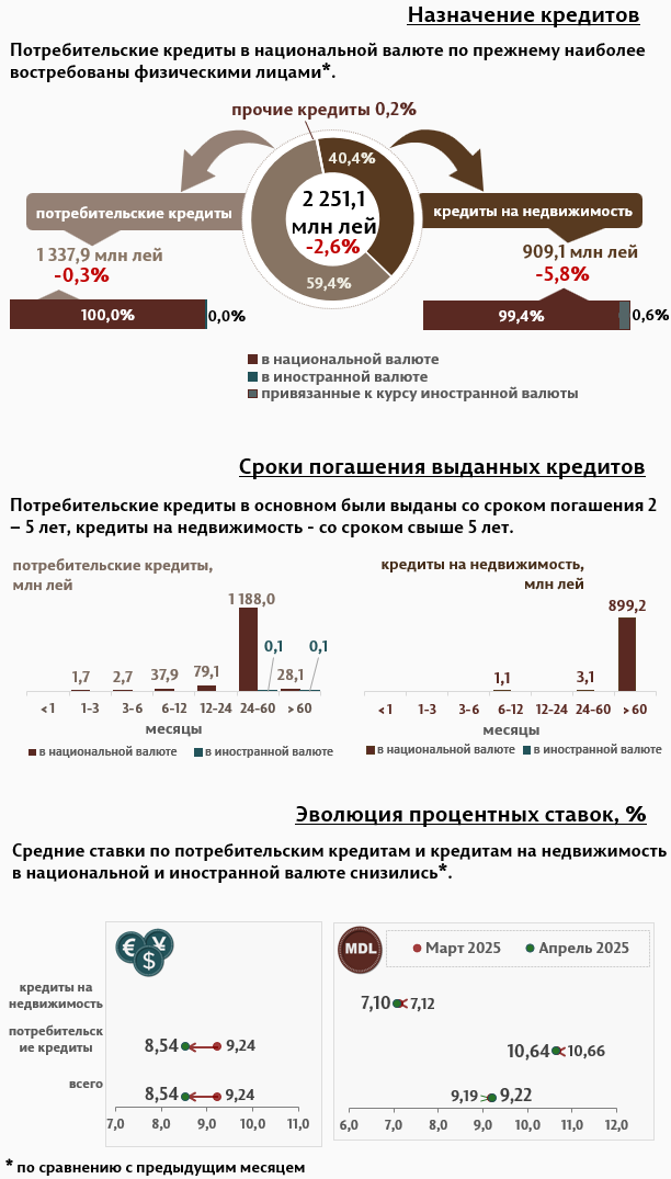 Физические лица в апреле 2025 года получили кредиты в объёме 2 251,1 миллиона леев, что на 2,6% меньше по сравнению с предыдущим месяцем, из которых значительная часть (59,4%) была представлена потребительскими кредитами (Инфографика 2). Большая часть потребительских кредитов, выданных физическим лицам (1 188,0 миллиона леев), была выдана в национальной валюте со сроком от 2 до 5 лет.