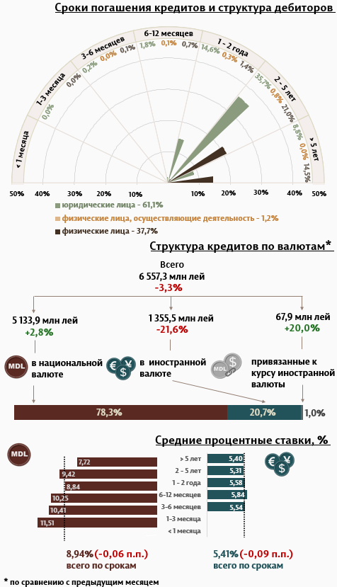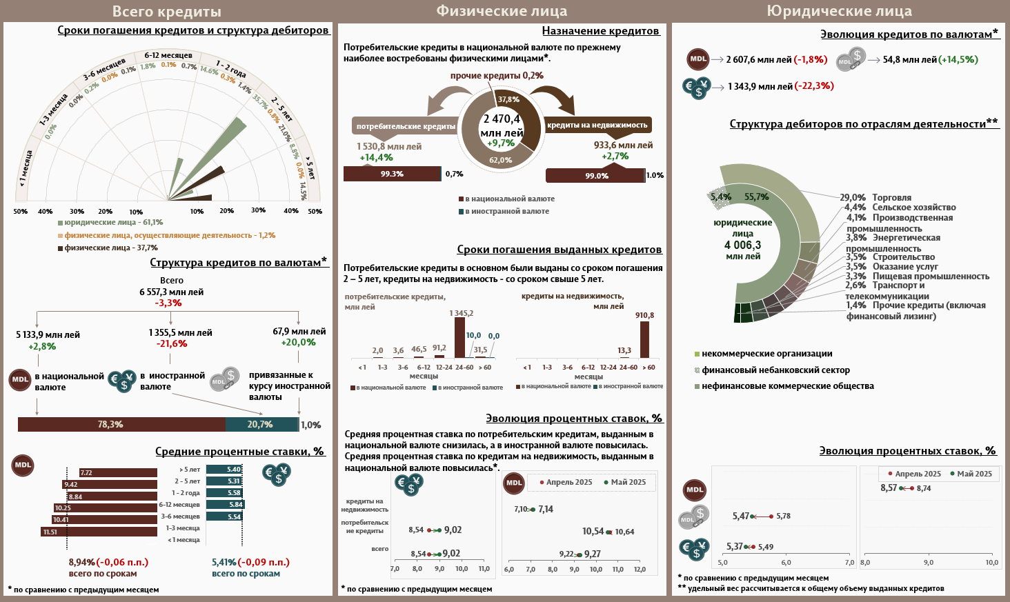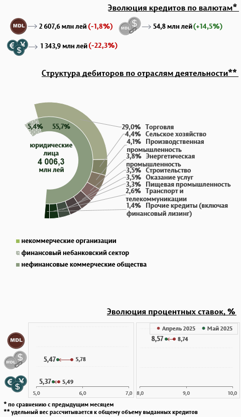 В мае 2025 г. вновь выданные кредиты1 составили 6 557,3 миллиона леев, на 3,3% меньше, чем в апреле 2025 г. (Инфографика 1). Основную часть (78,3%) составили кредиты в национальной валюте, объем которых увеличился на 2,8% по сравнению с предыдущим месяцем и достиг 5 133,9 миллиона леев.