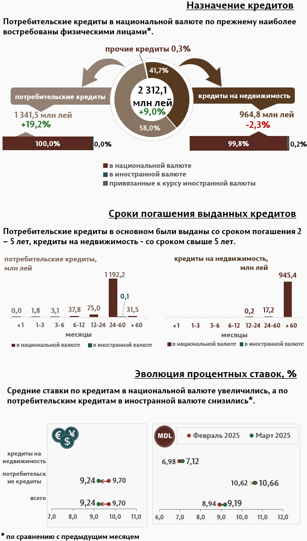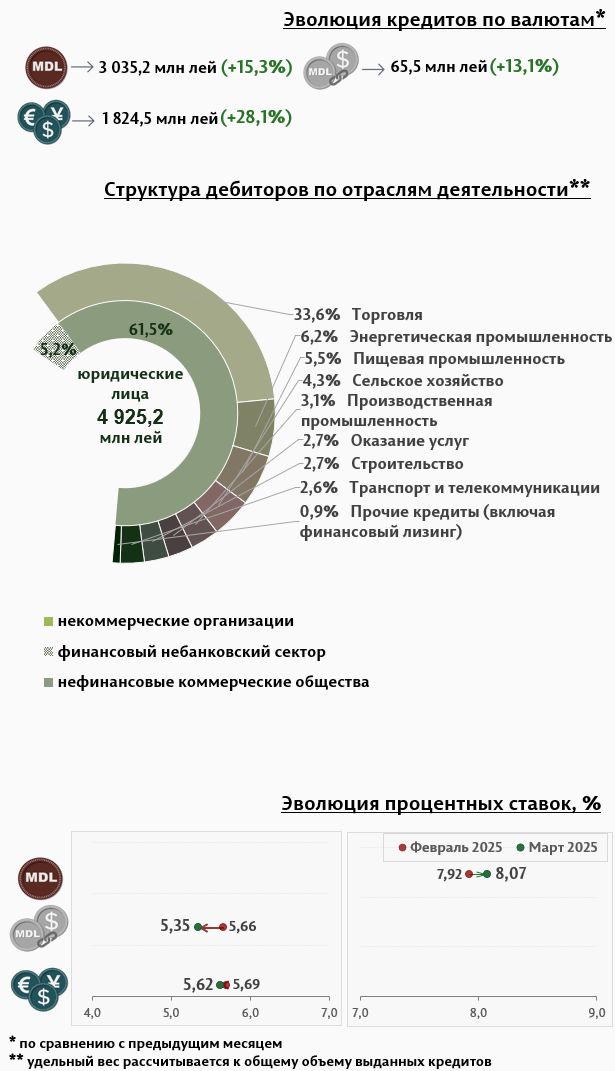 В марте 2025 г. вновь выданные кредиты составили 7 383,0 миллиона леев, на 16,7% больше, чем в феврале 2025 г. (Инфографика 1). Основная часть (74,4%) пришлась на кредиты в национальной валюте, которые составили 5 489,4 миллиона леев, увеличившись на 13,4% по сравнению с предыдущим месяцем.