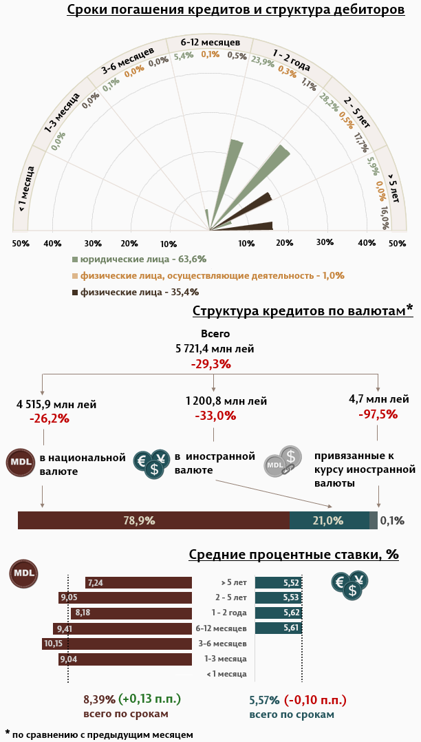 По сравнению с предыдущим месяцем (Инфографика 3), в отчетном периоде юридические лица востребовали меньше кредитов в национальной (-34,8%). Объём вновь выданных кредитов в иностранной валюте уменьшился на 32,9%, а объём кредитов, привязанных к курсу иностранной валюты2, значительно сократился на 98,0%.