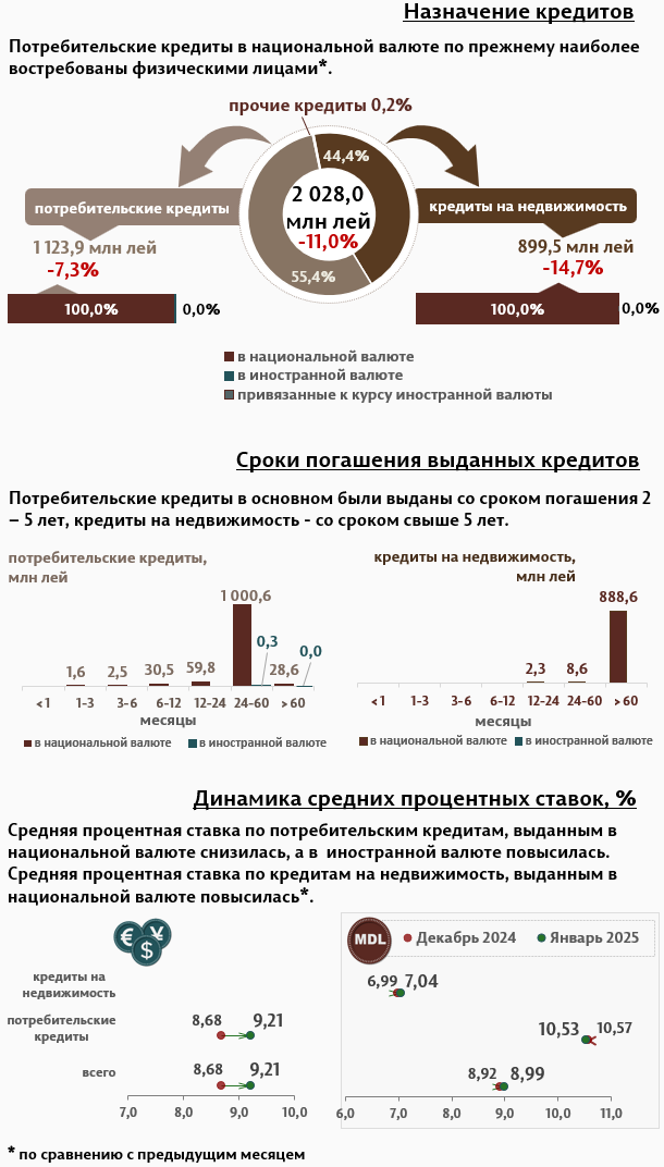Физические лица в январе 2025 года получили кредиты в объёме 2 028,0 миллиона леев, что на 11,0% меньше по сравнению с предыдущим месяцем, из которых значительная часть (55,4%) была представлена потребительскими кредитами (Инфографика 2). Большая часть потребительских кредитов, выданных физическим лицам (1 000,6 миллиона леев), была выдана в национальной валюте со сроком от 2 до 5 лет.