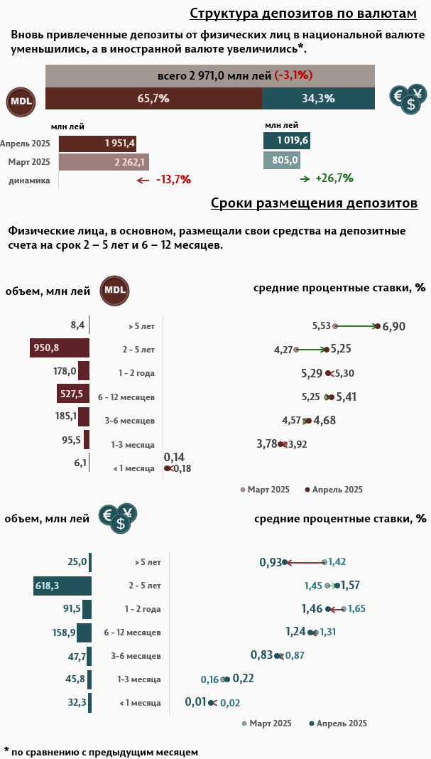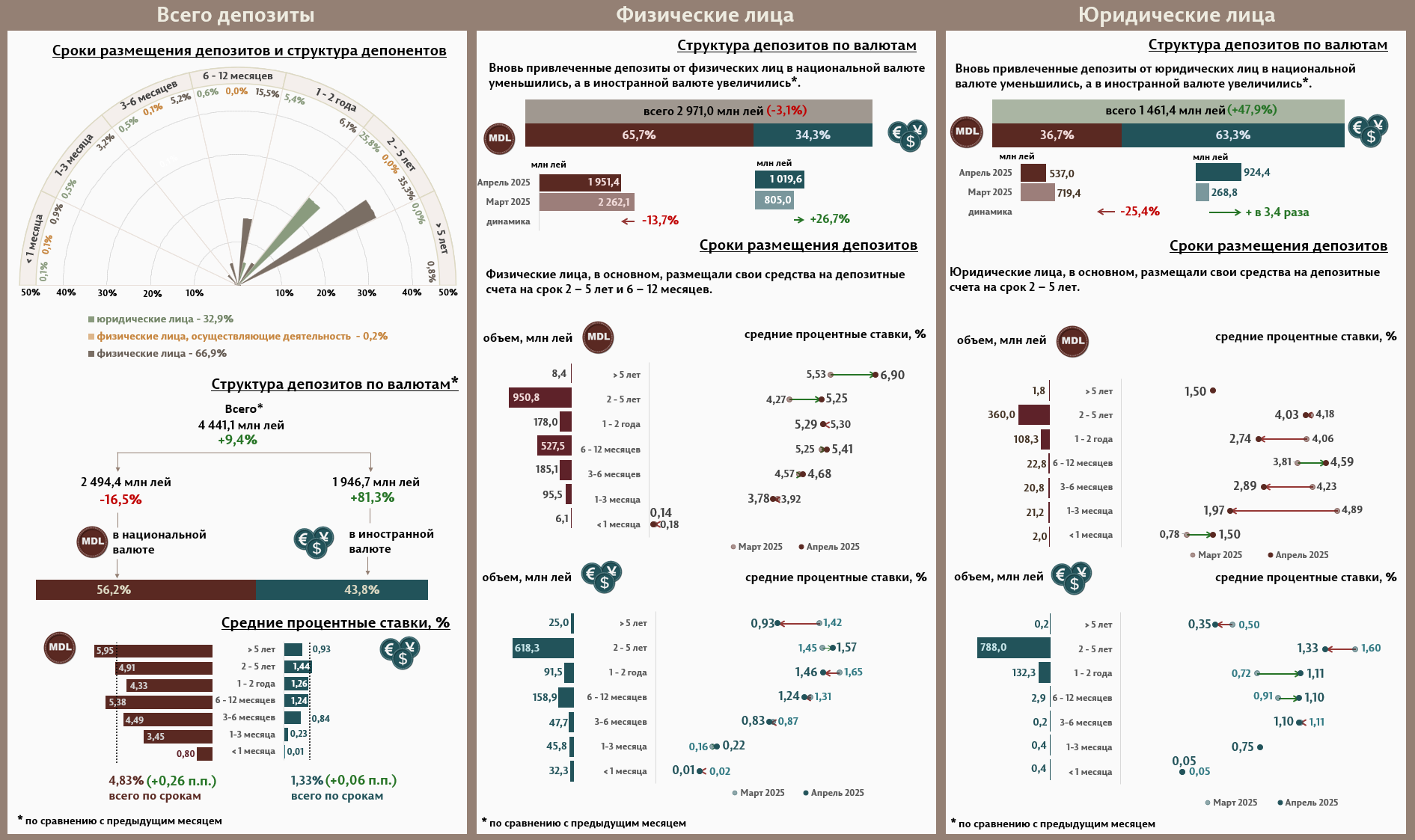В апреле 2025 г. вновь привлечённые срочные депозиты1 (Инфографика 1) составили 4 441,1 миллиона леев, увеличившись на 9,4% по сравнению с мартом 2025 года. Привлечённые депозиты в национальной валюте составили наибольшую долю в 56,2% или 2 494,4 миллиона леев, что на 16,5% меньше по сравнению с предыдущим месяцем. Депозиты, привлечённые в иностранной валюте, составили 1 946,7 миллиона леев, увеличившись на 81,3% по сравнению с предыдущим месяцем.