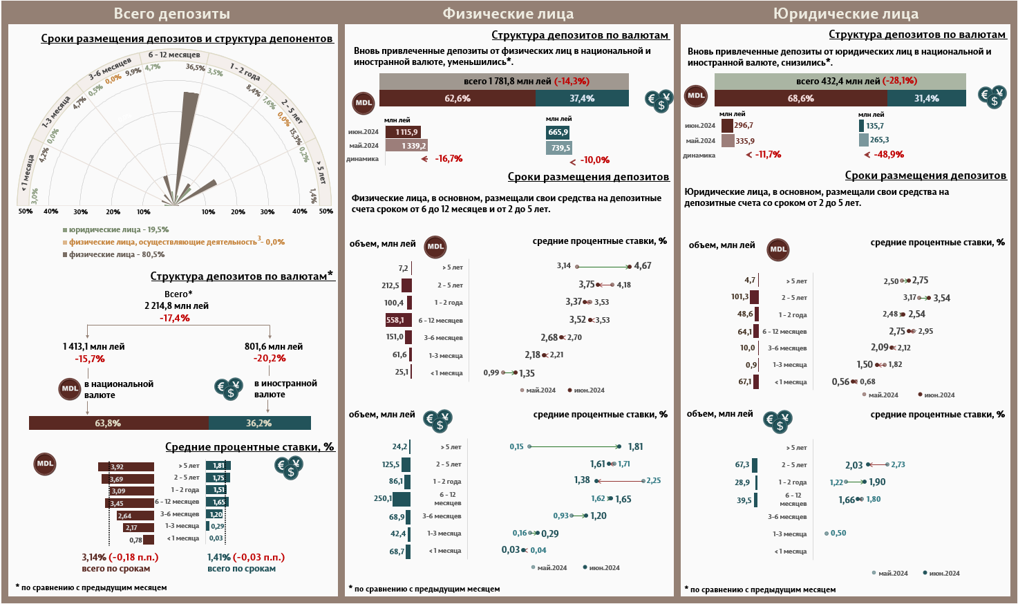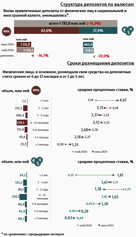 В июне 2024 г. вновь привлеченные срочные депозиты1 (Инфографика 1) составили 2 214,8 миллиона леев, уменьшившись на 17,4% по сравнению с маем 2024 года. Привлеченные депозиты в национальной валюте зарегистрировали значительную долю в 63,8% и составили 1 413,1 миллиона леев, уменьшившись на 15,7% по сравнению с предыдущим месяцем. Привлеченные депозиты в иностранной валюте, составили 801,6 миллиона леев, уменьшившись на 20,2% по сравнению с предыдущим месяцем.
