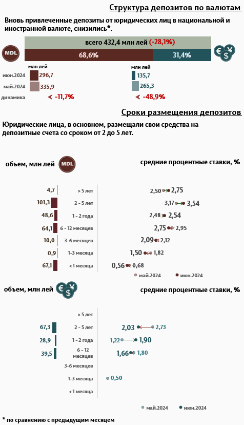 В июне 2024 г., по сравнению с предыдущим месяцем, депозиты юридических лиц (Инфографика 3) в национальной валюте снизились на 11,7%, а депозиты в иностранной валюте – на 48,9%. Депозиты юридических лиц в национальной валюте составили 296,7 миллиона леев, а в иностранной валюте – 135,7 миллиона леев.
