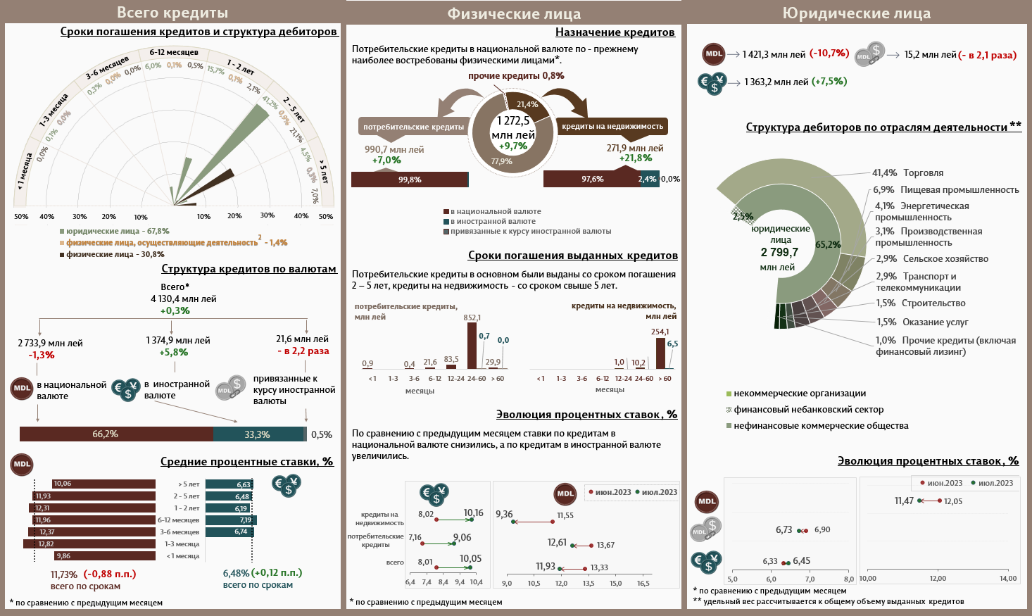 В июле 2023 г. вновь выданные кредиты1 (Инфографика 1) составили 4 130,4 миллиона леев, на 0,3% выше июня 2023 г. Основную часть (66,2%) составляют кредиты в национальной валюте, которые составили 2 733,9 миллиона леев, на 1,3% ниже по сравнению с предыдущим месяцем).