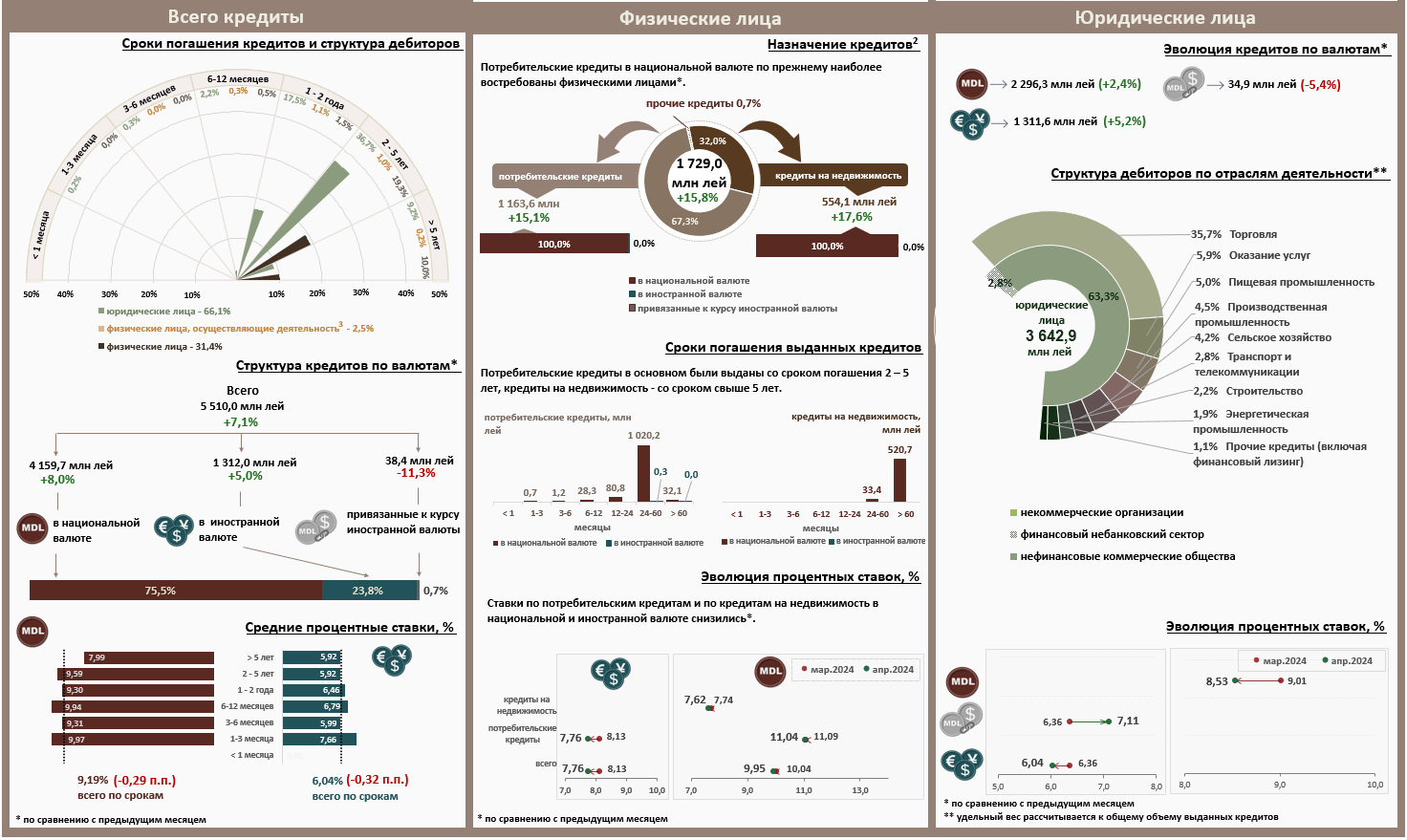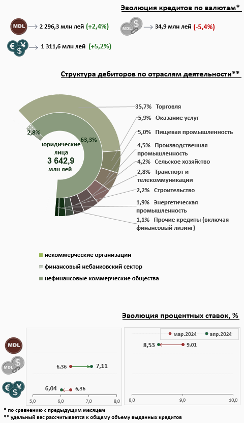 В апреле 2024 г. вновь выданные кредиты1 составили 5 510,0 миллиона леев, на 7,1% выше, чем в марте 2024 г. (Инфографика 1). Основная часть (75,5%) пришлась на кредиты в национальной валюте, которые составили 4 159,7 миллиона леев, увеличившись на 8,0% по сравнению с предыдущим месяцем.