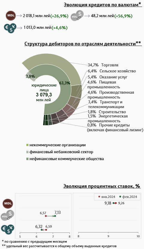 В феврале 2024 г. вновь выданные кредиты1 составили 4 587,6 миллиона леев, на 23,4% выше января 2024 г. (Инфографика 1). Основная часть (76,6%) пришлась на кредиты в национальной валюте, которые составили 3 513,9 миллиона леев, на 29,3% выше по сравнению с предыдущим месяцем.