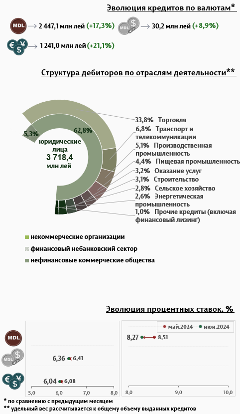 В июне 2024 г. вновь выданные кредиты1 составили 5 464,4 миллиона леев, на 13,7% выше, чем в мае 2024 г. (Инфографика 1). Основная часть (76,7%) пришлась на кредиты в национальной валюте, которые составили 4 190,9 миллиона леев, увеличившись на 12,1% по сравнению с предыдущим месяцем.