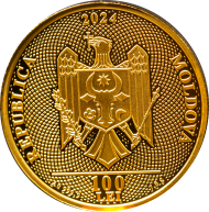 • надпись полукругом «REPUBLICA MOLDOVA», на свободном поле монеты - «Au 999,9», номинал «100 LEI» и «7,8 г».