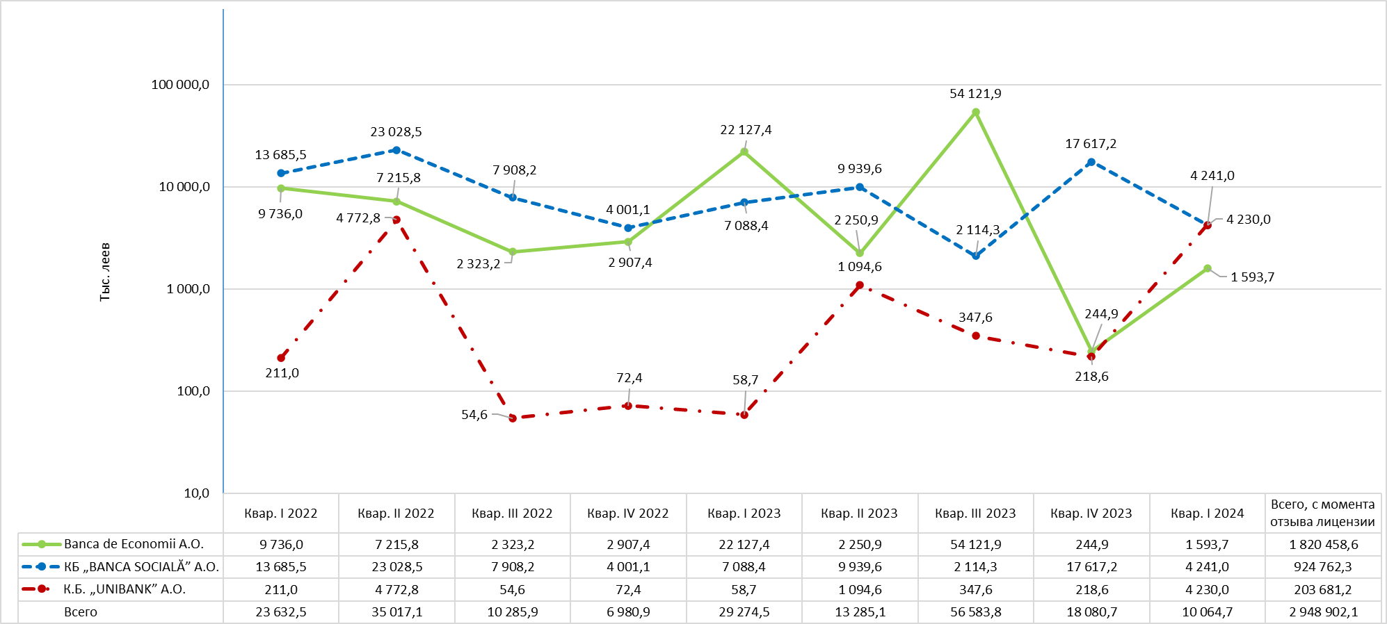 Ликвидаторы 3 банков в процессе ликвидации продолжают предпринимать меры по использованию активов в целях получения денежных средств. Таким образом, со дня отзыва лицензий (16.10.2015г.) и до 31.03.2024г. Banca de Economii A.О., КБ „BANCA SOCIALĂ” A.О. и К.Б. „UNIBANK” A.О. получили денежные средства на общую сумму 2 948 902,1 тыс. леев.