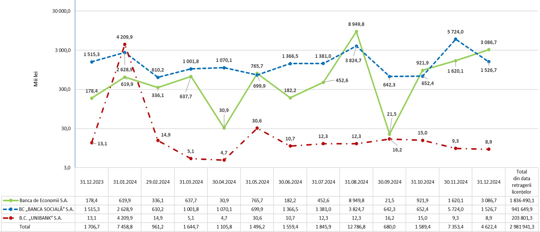 Ликвидаторы 3 банков в процессе ликвидации продолжают предпринимать меры по использованию активов в целях получения денежных средств. Таким образом, со дня отзыва лицензий (16.10.2015г.) и до 31.12.2024г. Banca de Economii A.О., КБ „BANCA SOCIALĂ” A.О. и К.Б. „UNIBANK” A.О. получили денежные средства на общую сумму 2 981 941,3 тыс. леев.