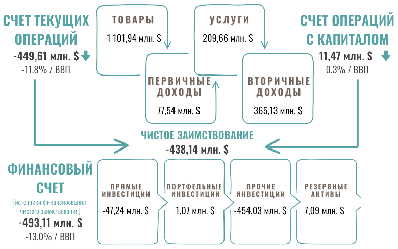 По предварительным данным, в I квартале 2024 года, дефицит текущего счета платежного баланса Республики Молдова достиг 449,61 млн. долл. США, 9,9% по сравнению с I кварталом 2023 года. По отношению к ВВП, текущий счет составил -11,8%. Счет операций с капиталом зафиксировал чистый приток на сумму 11,47 млн. долл. США, а финансовый счет – чистый приток финансовых средств, равный 493,11 млн. долл. США.