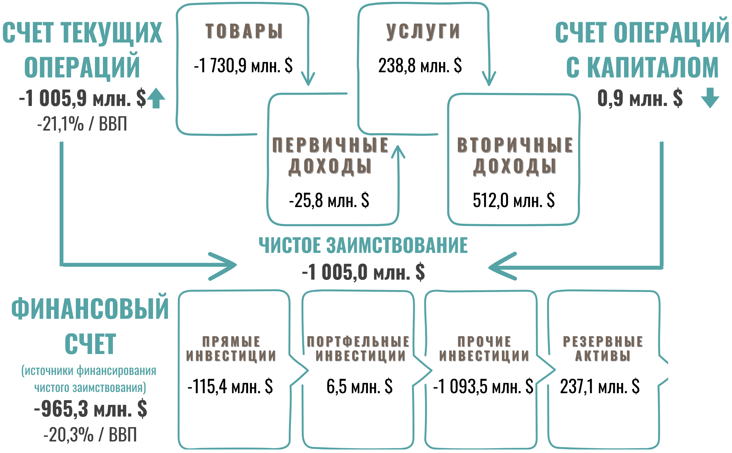 По предварительным данным, во II квартале 2025 года, дефицит текущего счета платежного баланса Республики Молдова достиг -1 005,91 млн. долл. США, счет операций с капиталом зафиксировал чистый приток на сумму 0,90 млн. долл. США, а финансовый счет – чистый приток финансовых средств, равный 965,33 млн. долл. США.
