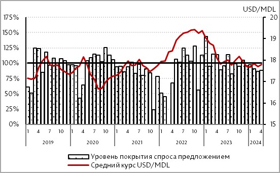 В апреле 2024 года чистый спрос на валюту со стороны юридических лиц был покрыт чистым предложением от физических лиц1 на 88,2% по сравнению с 86,6% в марте 2024.