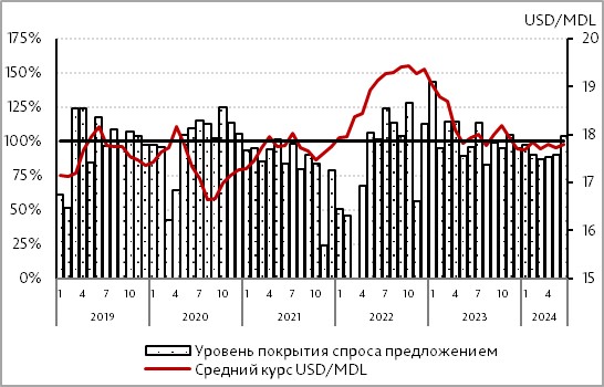 В июне 2024 года чистый спрос на валюту со стороны юридических лиц был покрыт чистым предложением от физических лиц1 на 103,8% по сравнению с 90,1% в мае 2024.