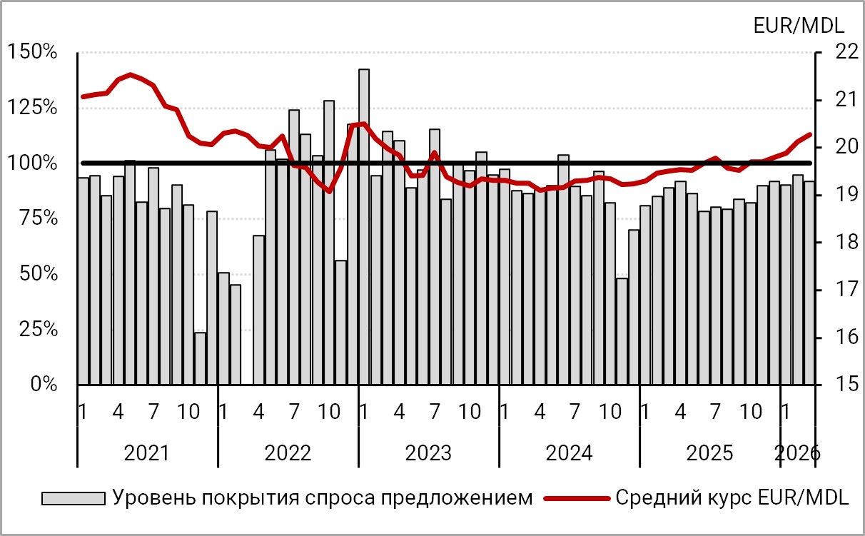 Обменный курс молдавского лея по отношению к евро в средних значениях изменился от 20,1250 EUR/MDL в феврале 2026 до 20,1430 EUR/MDL в марте 2026.