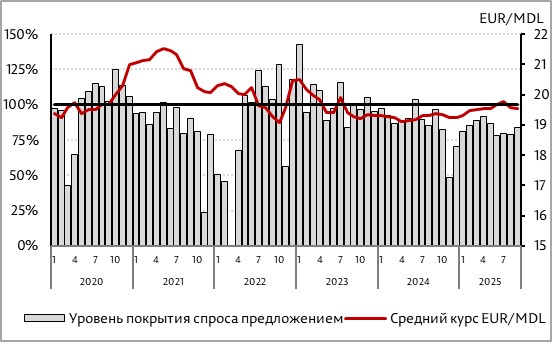 В сентябре 2025 года чистый спрос на валюту со стороны юридических лиц был покрыт чистым предложением от физических лиц1 на 83,6% по сравнению с 79,2% в августе 2025.