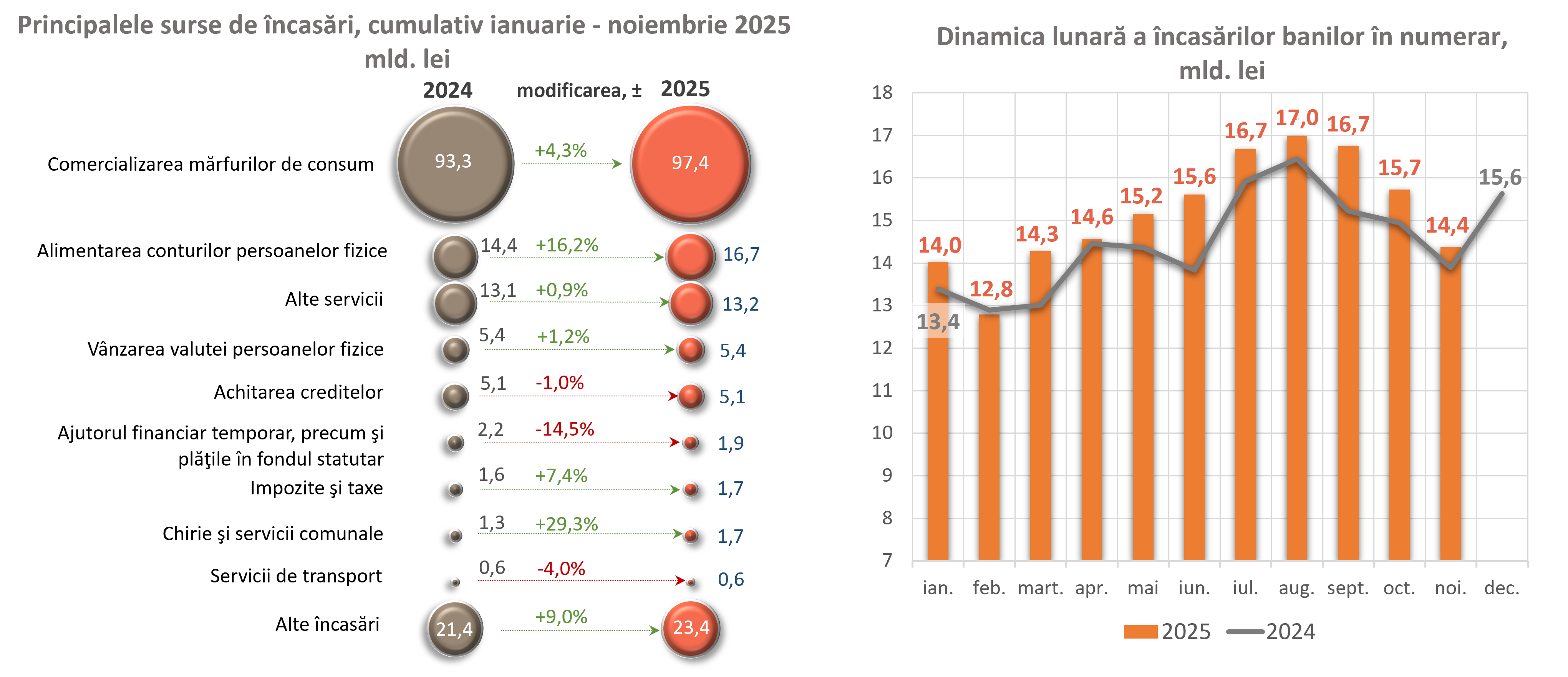 Volumul încasărilor de numerar pe conturile curente și conturile de depozit ale persoanelor fizice a înregistrat valoarea de 16 720,3 milioane lei, în creștere cu 2 331,0 milioane lei (+16,2 la sută).