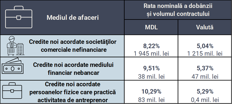 În luna ianuarie 2026, creditele noi1 acordate au constituit 5 254 milioane lei, fiind contractate în proporție de 64,5 la sută de mediul de afaceri și 35,5 la sută de persoanele fizice.