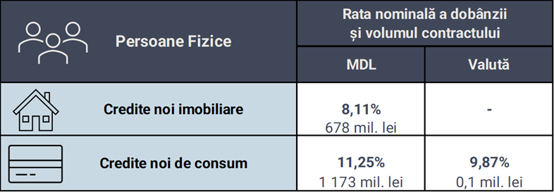 Volumul contractelor noi de creditare încheiate cu persoanele fizice și ratele nominale ale dobânzilor aferente sunt reflectate în tabelul de mai jos.