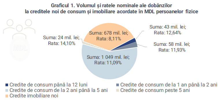 În luna de referință, persoanele fizice au contractat credite noi preponderent în lei, volumul lunar al acestora și ratele nominale ale dobânzilor aferente sunt detaliate în Graficul 1.