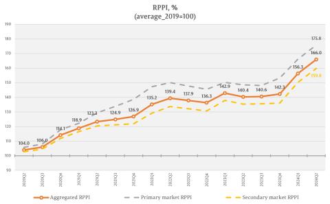 Показатель RPPI, соответствующий ценам на первичном рынке жилой недвижимости, составил 175,8 процента, что больше на 5,8 процента значения за 1-й квартал 2024 года, но больше на 18,3 процента значения за 2-й квартал 2023 года.