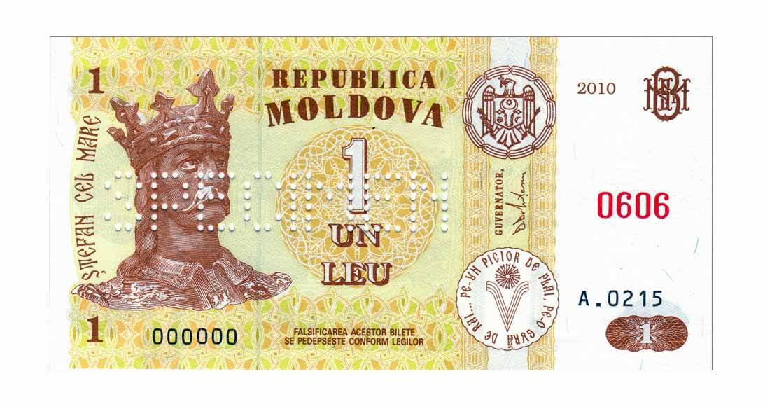 The front side of the banknote:The Coat of Arms of the Republic of Moldova, the inscription "REPUBLICA MOLDOVA", the portrait of Ştefan cel Mare, a national multicolour ornament, two vertical decorative elements, the central rosette, the nominal value written in figures and words, the abbreviation "BNM", the facsimile " GUVERNATOR, D. Drăguţanu", the circle wording "PE-UN PICIOR DE PLAI, PE-O GURĂ DE RAI...", Victory Token - "V", the year of banknote issuance "2010", the banknote number and series, the inscription "FALSIFICAREA ACESTOR BILETE SE PEDEPSEŞTE CONFORM LEGILOR"; |