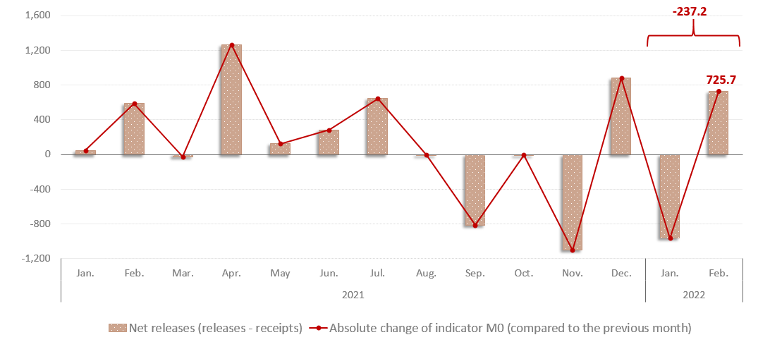 In February 2022, the currency in circulation (M0)1 amounted to MDL 31,461.4 million, decreasing by MDL 237.2 million (0.7%) compared to December 2021 (Chart no. 1) as a result of exceeding of the volume of cumulative receipts over the volume of cumulative releases per banking system2 by MDL 237.2 million in period January – February 2022.