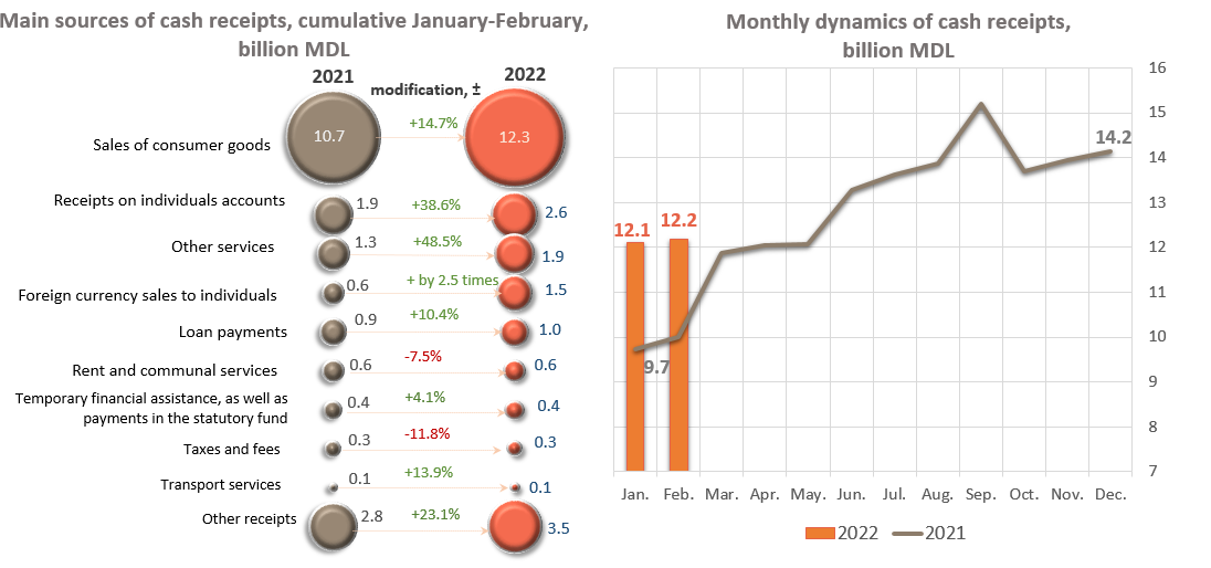 At the same time, in February 2022, the volume of cash receipts amounted MDL 12,189.2 million (+0.7% compared to January 2022 and +21.9% compared to February 2021).