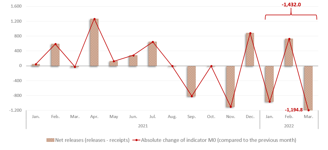 In March 2022, the currency in circulation (M0)1 amounted to MDL 30,266.6 million, decreasing by MDL 1,432.0 million (4.5%) compared to December 2021 (Chart no. 1) as a result of exceeding of the volume of cumulative receipts over the volume of cumulative releases per banking system2 by MDL 1,432.0 million in the period of January – March 2022.