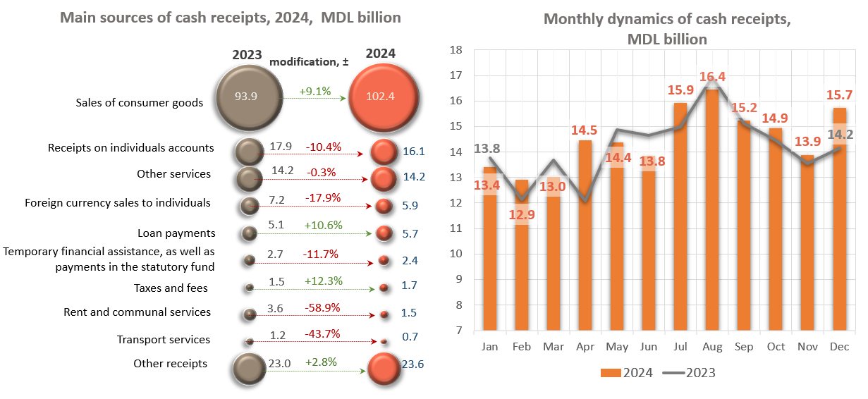 A significant increase was recorded in the cash receipts from the sale of consumer goods (regardless of the sales channel) by MDL 8,509.3 million (+9.1%) up to the total amount of MDL 102,441.2 million, which represents 58.8 percent of the total volume of receipts (Chart 1). Substantial increases were also recorded for other cash receipts2 – by MDL 635.4 million (+2.8%), as well as for receipts from loan payments – by MDL 545.4 million (+10.6%).