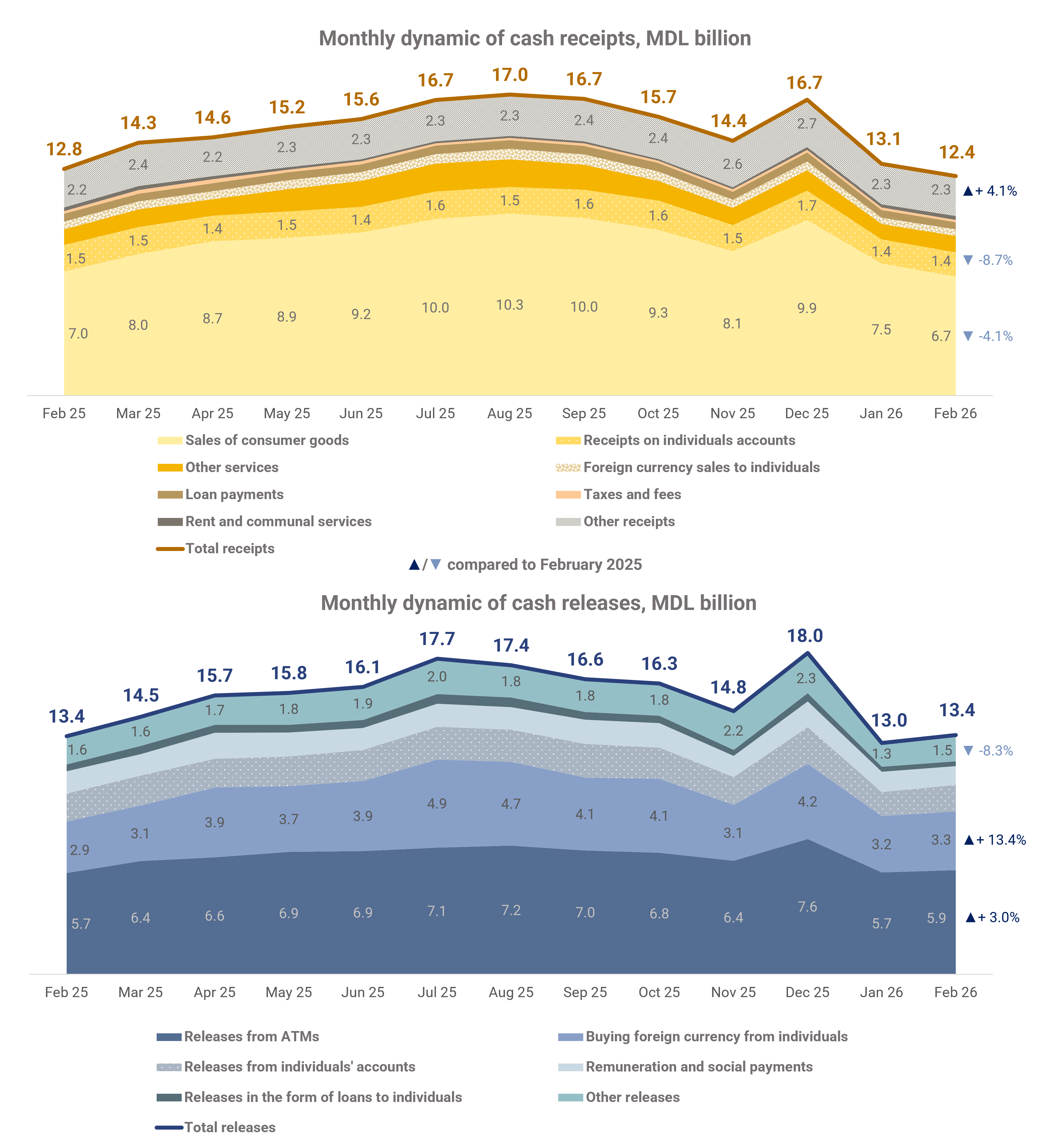 The volume of cash receipts in February 2026 amounted to MDL 12,398 million, decreasing by MDL 398 million (-3.1%) compared to February 2025