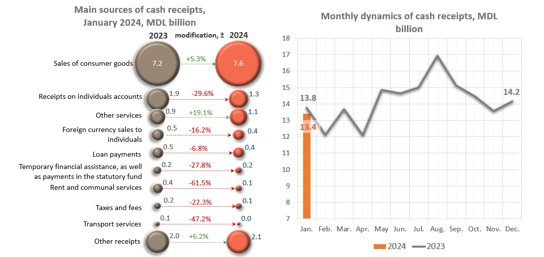 The volume of cumulative cash receipts in January 2024 decreased by MDL 361.1 million (-2.6%) compared to January 2023 and amounted to MDL 13,395.0 million.