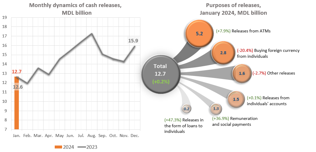 The volume of cash releases from banks in January 2024 increased by MDL 27.2 million (+0.2%) compared to January 2023 and amounted to MDL 12,668.8 million (Chart 2).