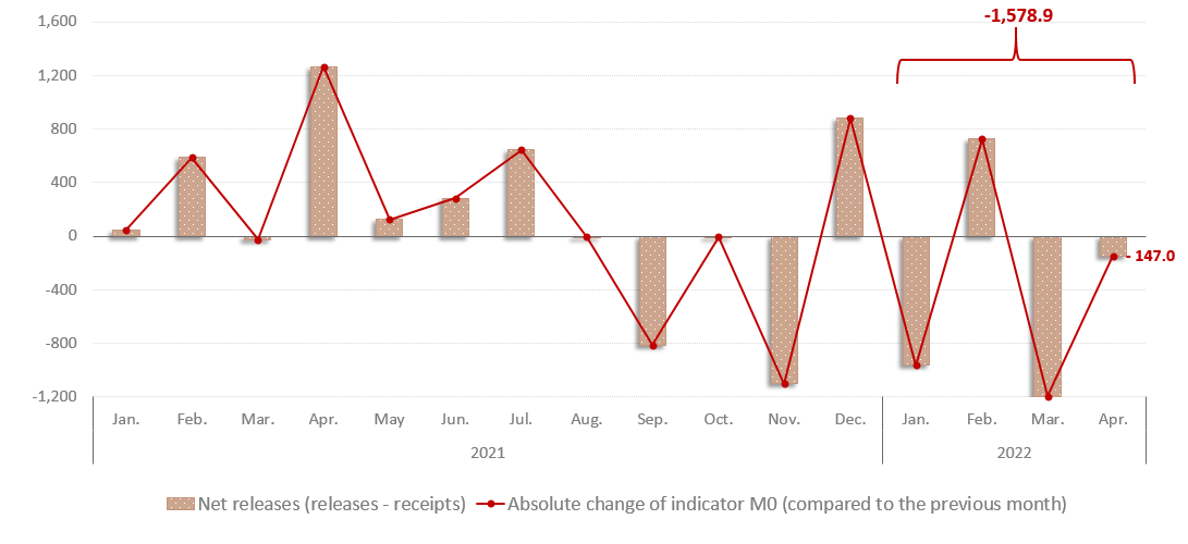 In April 2022, the currency in circulation (M0)1 amounted to MDL 30,119.7 million, decreasing by MDL 1,579.0 million (5.0%) compared to December 2021 (Chart 1) due to of exceeding of the volume of cumulative receipts over the volume of cumulative releases per banking system2 by MDL 1,578.9 million in the period of January – April 2022.