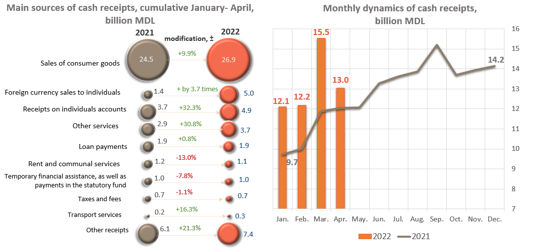 At the same time, in April 2022, the volume of cash receipts amounted to MDL 13,040.1 million (-16.0% compared to March 2022 and +8.2% compared to April 2021).