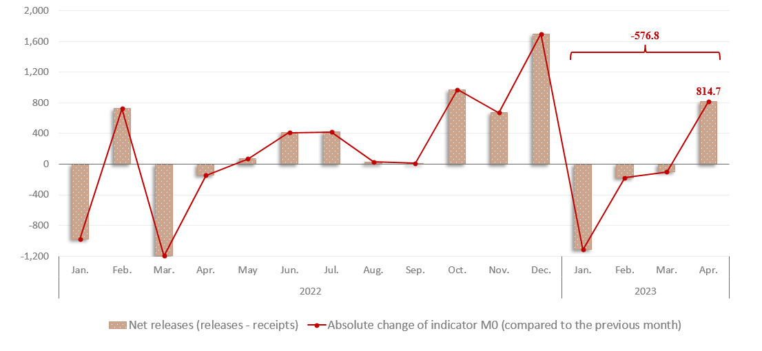 In April 2023, the currency in circulation (M0)1 amounted to MDL 33,829.2 million, decreasing by MDL 576.8 million (-1.7%) compared to December 2022 (Chart 1) due to decreasing volume of cumulative releases over the volume of cumulative receipts per banking system2 by MDL 576.7 million in January – April 2023.