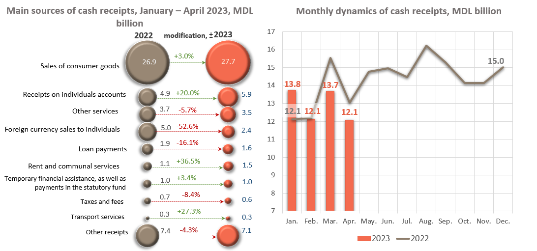 In January – April 2023, the volume of cash receipts decreased by MDL 1,241.5 million (-2.3%) compared to the same period of the previous year and amounted to MDL 51,628.2 million.
