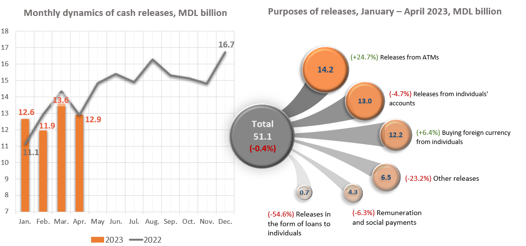 At the same time, in January – April 2023 ATM withdrawals increased by MDL 2,820.2 million (+24.7%) compared to the same period of the previous year, which amounted to MDL 14,241.9 million, accounting for 27.9% of the total volume of cash withdrawals. There was also a significant increase of MDL 730.7 million (+6.4%) in the volume of cash released for the purchase of foreign currency from individuals, which amounted to MDL 12,171.4 million (equivalent to USD  652.3 million), accounting for 23.8% of the total volume of cash releases.