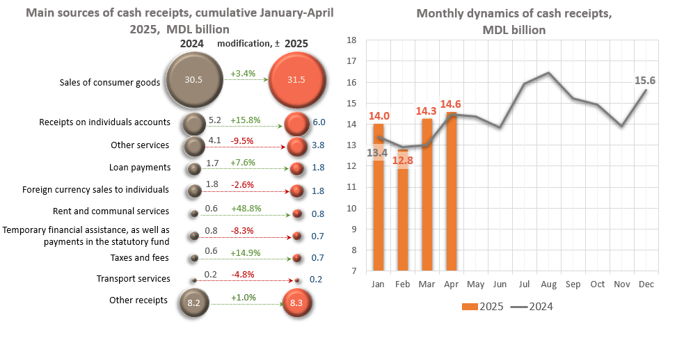 The volume of cumulative cash receipts in January-April 2025 increased by MDL 1,906.6 million (+3.5%) compared to the similar period of the previous year and amounted to MDL 55,676.8 million.