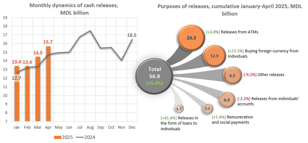 At the same time, in January-April 2025, were recorded decreases in releases for other purposes by MDL 662.6 million (-9.2%) and in cash releases from individuals’ accounts by MDL 145.9 million (-2.2%).
