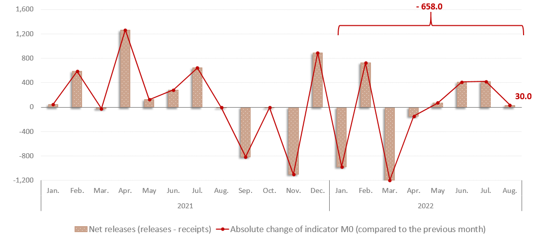 In August 2022, the currency in circulation (M0)1 amounted to MDL 31,053.5 million, decreasing by MDL 658.0 million (2.1%) compared to December 2021 (Chart 1) due to exceeding of the volume of cumulative receipts over the volume of cumulative releases per banking system2 by MDL 657.9 million in the period of January – August 2022.