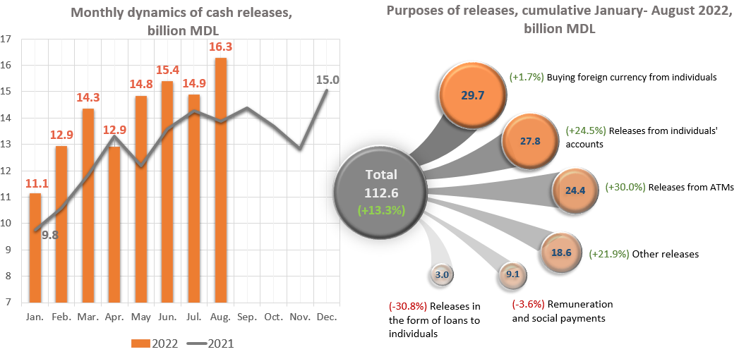 It should be noted that releases from ATMs had a significant share of 21.6% of total releases, increasing in January - August 2022 by MDL 5,626.9 million (30.0%) compared to the same period of the previous year.