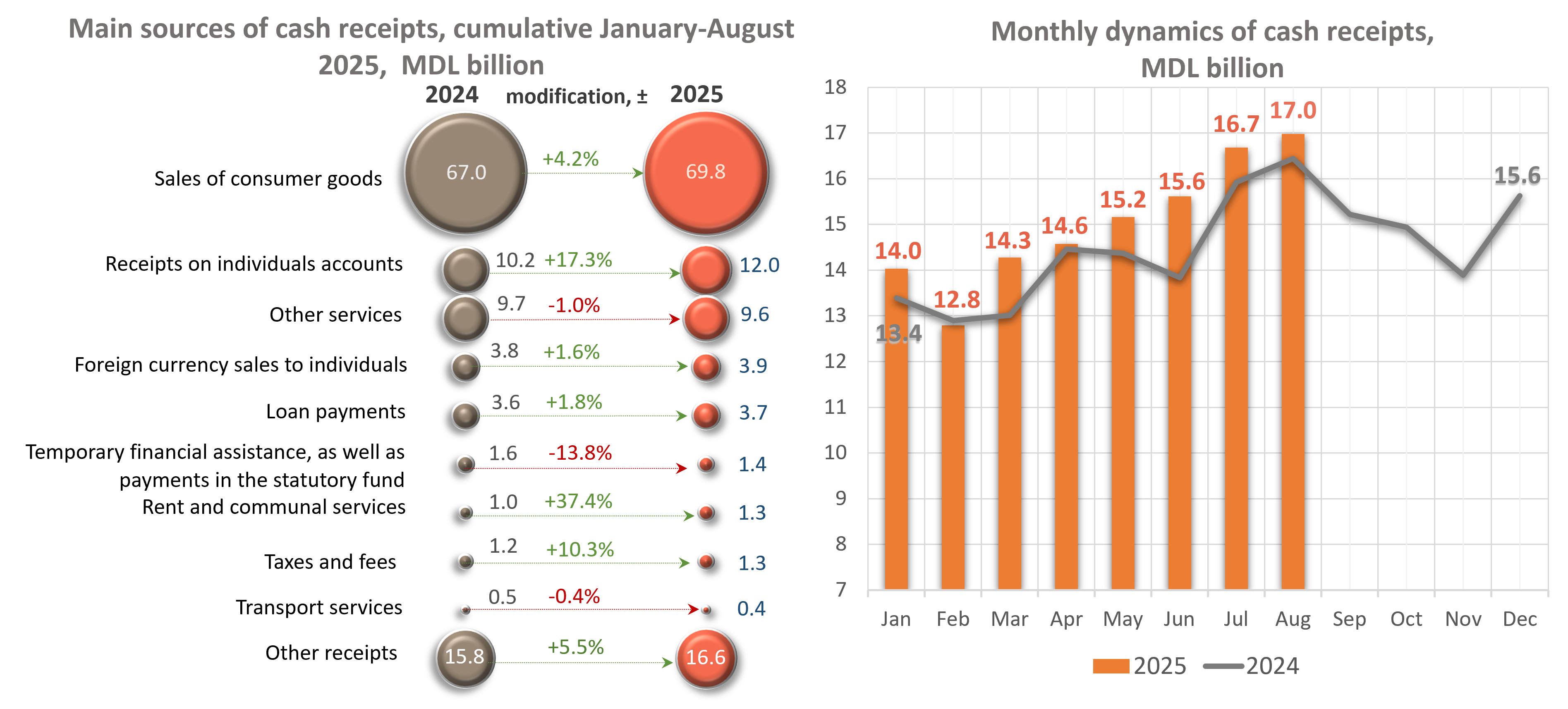 In January-August 2025, the volume of cumulative cash releases from bank vaults exceeded the volume of cumulative cash receipts in the banking system1 by MDL 3,800.7 million.