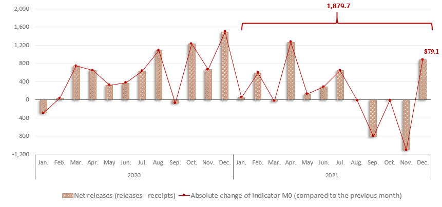 In December 2021, the currency in circulation (M0)1 amounted to MDL 31,698.6 million, increasing by MDL 1,879.7 million (6.3%) compared to December 2020 (Chart no. 1) as a result of exceeding of the volume of cumulative releases over the volume of cumulative receipts per banking system by MDL 1,879.9 million2 in period January – December 2021.