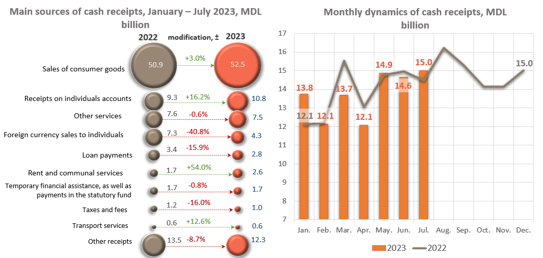 The volume of cumulative cash receipts in licensed banks in January – July 2023, decreased by MDL 927.4 million (-1.0%) compared to the same period of the last year and amounted to MDL 96,135.3 million. In cumulative receipts, a significant decrease was recorded in receipts from the sale of foreign currency to individuals by MDL 2,972.4 million (-40.8%), amounting to MDL 4,305.4 million, which is the equivalent of USD2 234.8 million (Chart 1). Also, other receipts decreased by MDL 1,167.4 million (-8.7%), as well as the receipts for the payment of loans by MDL 532.2 million (-15.9%).