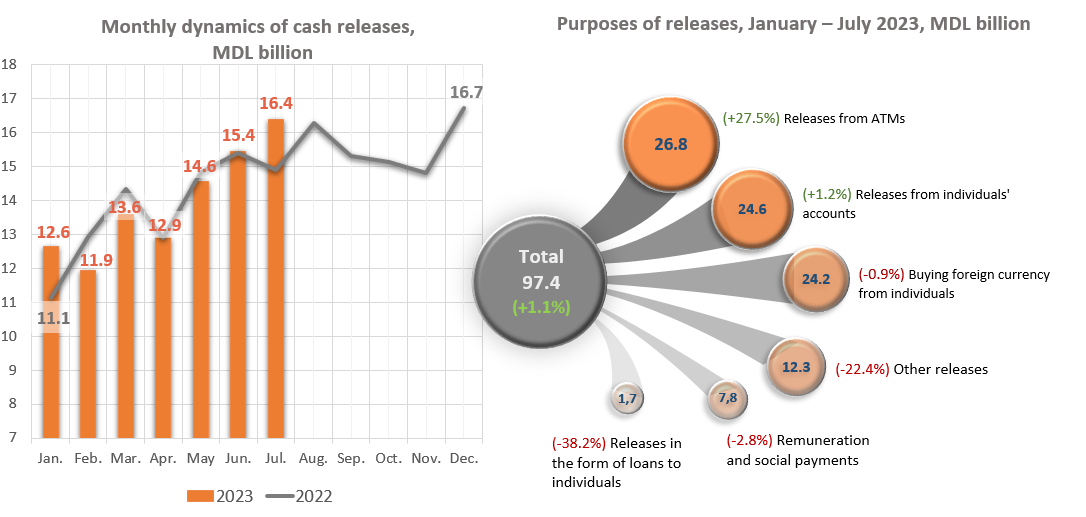 In January - July 2023 cash releases for the purchase of currency from individuals decreased by MDL 221.9 million (-0.9%) up to the level of MDL 24,212.5 million (equivalent to USD4 1,320.3 million).