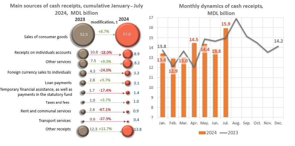 At the same time, in January – July 2024, considerable decreases were recorded in cash receipts on current accounts and deposit accounts of individuals – by MDL 1,950.8 million (-18.0%), in cash receipts from payments for rent and utilities – by MDL 1,745.7 million ( 67.1%), as well as for receipts from the sale of foreign currency to individuals – by MDL 1,033.6 million (-24.0%), amounting to MDL 3,271.7 million, which is the equivalent of USD3 184.2 million.