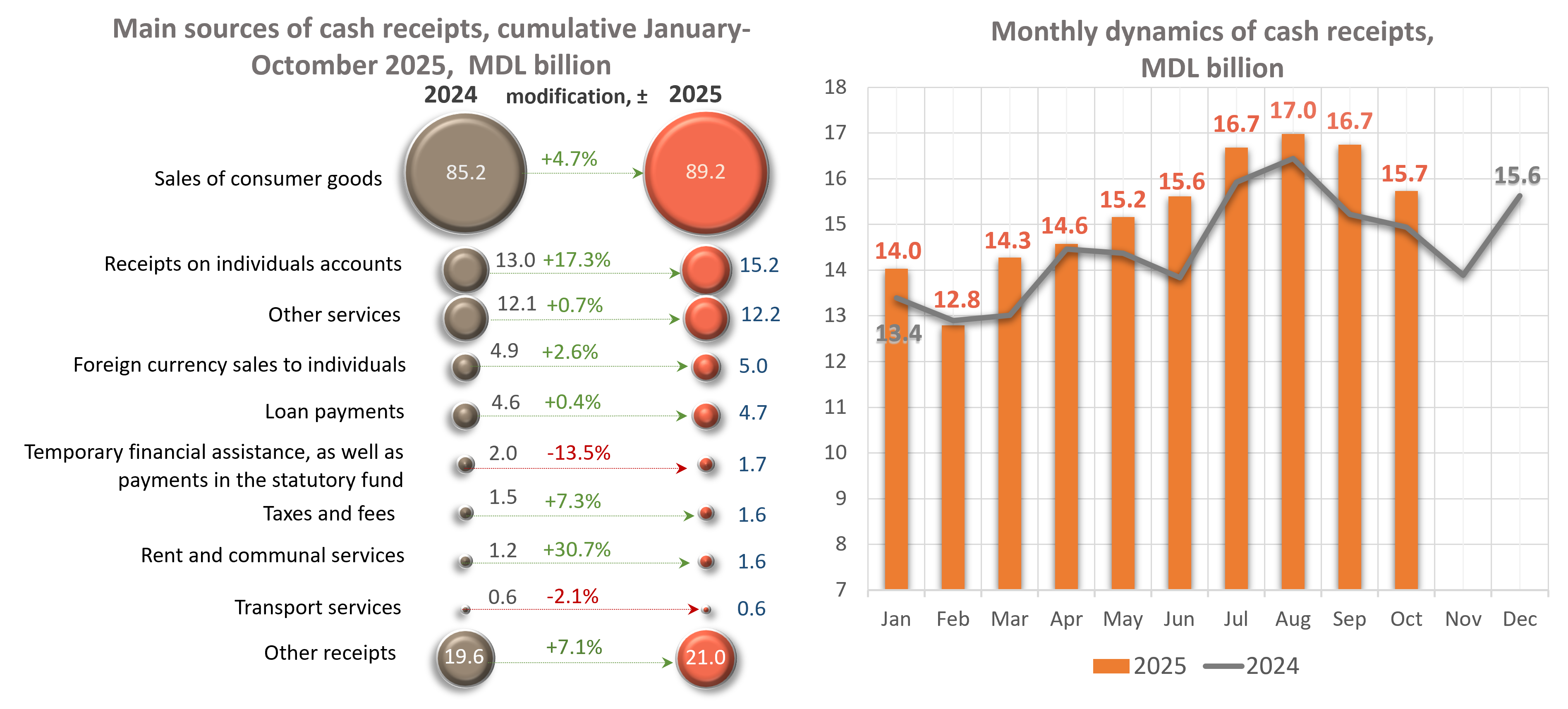 In January-October 2025, the volume of cumulative cash releases from bank vaults exceeded the volume of cumulative cash receipts in the banking system1 by MDL 4,210.9 million.